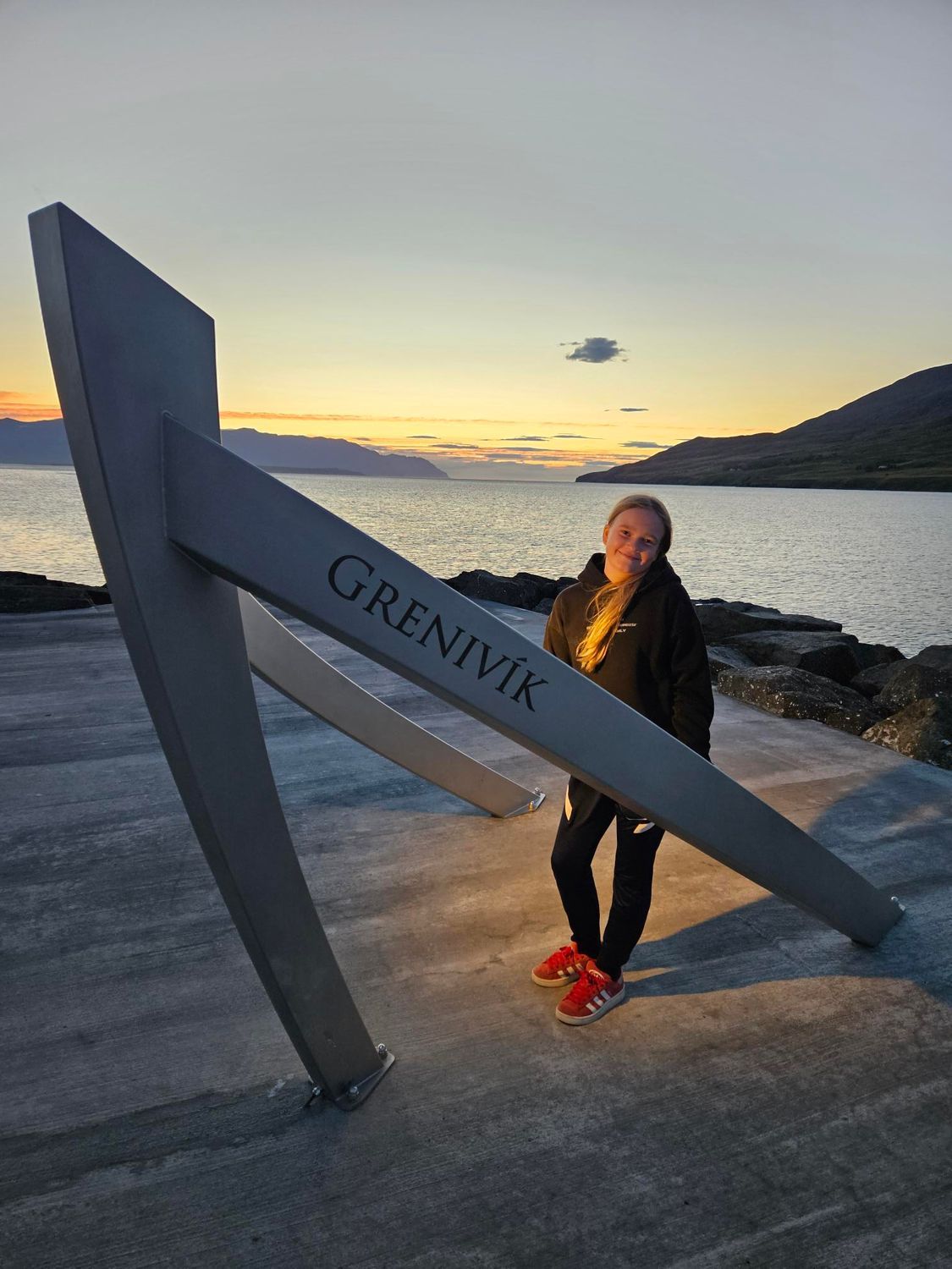 Listaverkið Sókn á Gömlu bryggju á Grenivík í ljósaskiptunum. Á myndinni er Elín Björk Friðþjófsdóttir, barnabarn sveitastjórans.