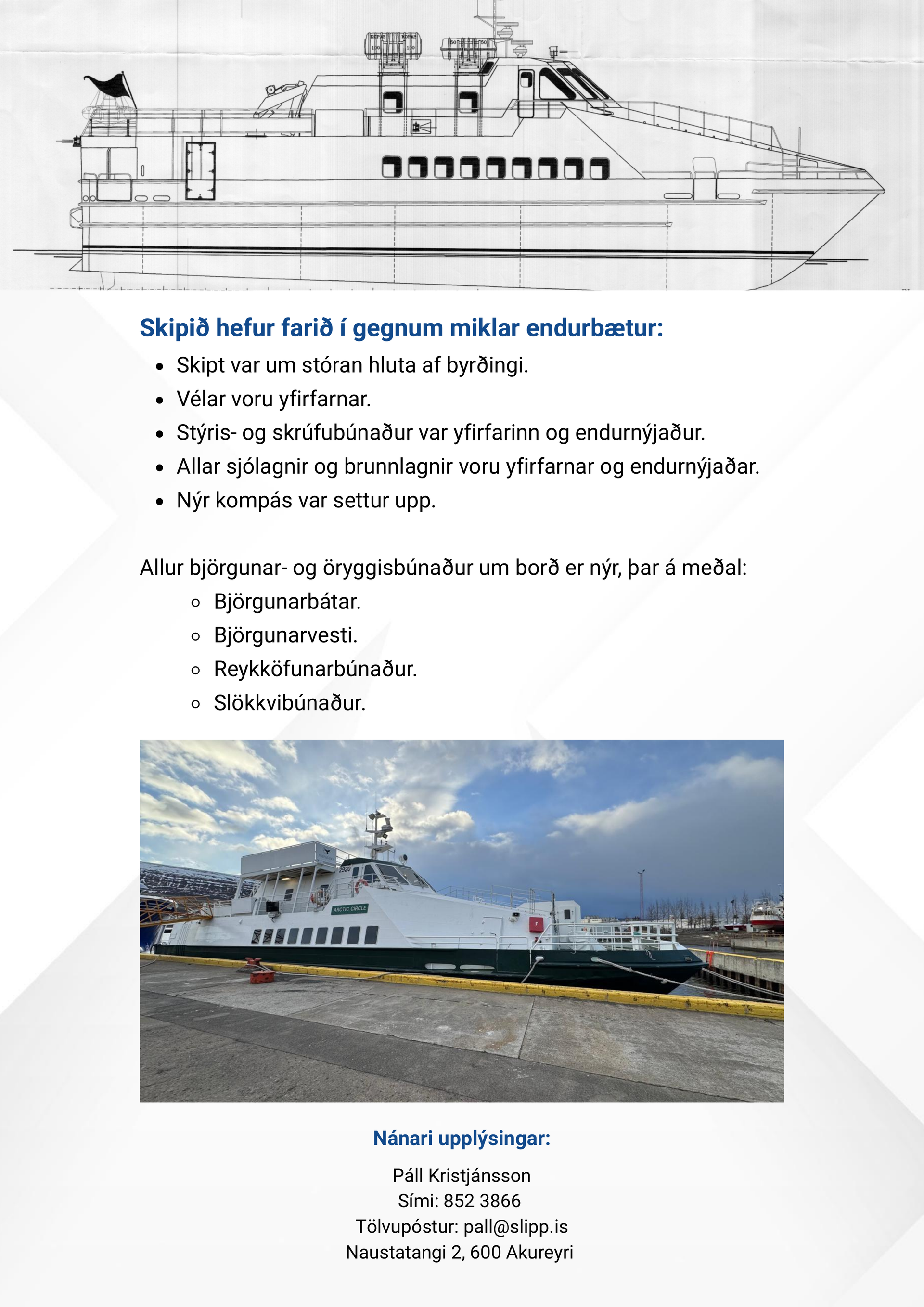 Slippurinn Akureyri kynnir nú til sölu öflugt og vel viðhaldið farþegaskip með langa reynslu í farþegaflutningum og hvalaskoðun.